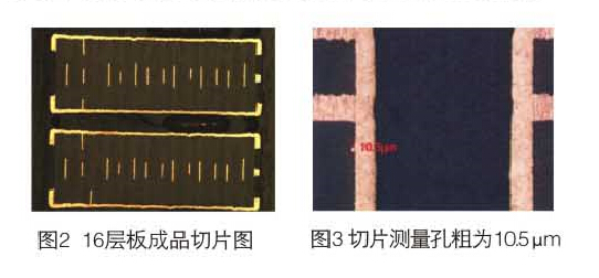 由于各層疊加導致板件和銅層超厚,對鉆頭磨損嚴重,容易折斷鉆刀,對于孔數、落速和轉速適當的下調。精確測量板的漲縮,提供精確的系數;層數≥14層、孔徑≤0.2mm或孔到線距離≤0.175mm,采用孔位精度≤0.025mm 的鉆機生產;直徑φ4.0mm以上孔徑采用分步鉆孔,厚徑比12:1采用分步鉆,正反鉆孔方法生產;控制鉆孔披鋒及孔粗,高層板盡量采用全新鉆刀或磨1鉆刀鉆孔,孔粗控制25um以內。為改善高層厚銅板的鉆孔毛刺問題,經批量驗證,使用高密度墊板,疊板數量為一塊,鉆頭磨次控制在3次以內,可有效改善鉆孔毛刺,如圖2、圖3所示。