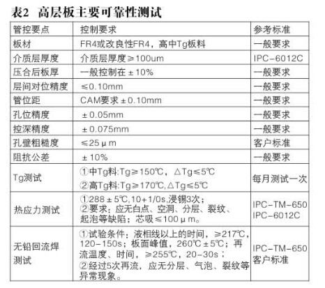 高層板一般為系統板,比常規多層板厚、更重、單元尺寸更大,相應的熱容也較大,在焊接時,需要的熱量更多,所經歷的焊接高溫時間要長。在217℃(錫銀銅焊料熔點)需50秒至90秒,同時高層板冷卻速度相對慢,因此過回流焊測試的時間延長,并結合IPC-6012C、 IPC-TM-650標準以及行業要求,對高層板的主要可靠性測試,如表2所述。