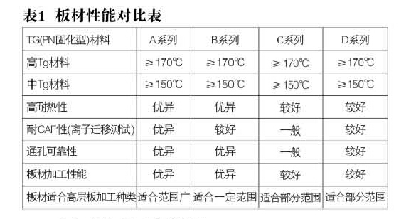 隨著電子元器件高性能化、多功能化的方向發展,同時帶來高頻、高速發展的信號傳輸,因此要求電子電路材料的介電常數和介電損耗比較低,以及低CTE、低吸水率和更好的高性能覆銅板材料,以滿足高層板的加工和可靠性要求。常用的板材供應商主要有A系列、B系列、C系列、D系列,這四種內層基板的主要特性對比,見表1。對于高層厚銅電路板選用高樹脂含量的半固化片,層間半固化片的流膠量足以將內層圖形填充滿,絕緣介質層太厚易出現成品板超厚,反之絕緣介質層偏薄,則易造成介質分層、高壓測試失效等品質問題,因此對絕緣介質材料的選擇極為重要。